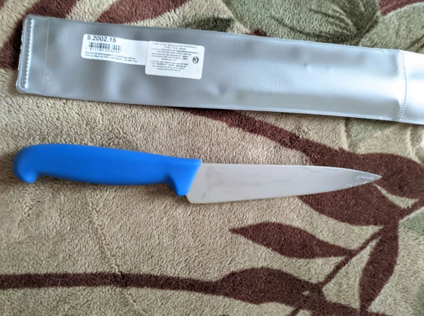 Очень хороший нож, чаще им муж пользуется, рукоятка лежит в руке, как влитая. Приехал к нам в силиконовом чехле, со всеми наклейками и гравировкой на лезвии. В работе показал, что нужно беречь пальцы - очень острый. К счастью, можно мыть в посудомоечной машине и не порезаться во время чистки. Режу им не только мясо, но и любые овощи, хлеб, замороженное мясо. Яркая ручка не дает потеряться ножу на кухонном столе. Советую всем попробовать ножи этого производителя - не разочаруетесь!